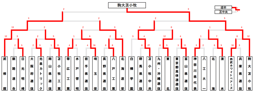| 駒大苫小牧 | ●0-1 | – | ○16-0 | 1勝1敗 |