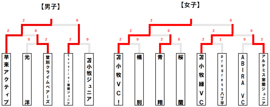 胆振中体連バレーボール大会 X Facebook はてブ LINE コピー 2025.07.11 概要 日程:2025年7月6日 会場:白老町総合体育館 方式:トーナメント戦 出場:男子5チーム、女子8チーム 全道大会:7月31日~8月2日に深川市で開催。男女優勝チームが進出 成績 男子 優勝:早来アクティブ 準優勝:Escalier室蘭ジュニア 3位:苫小牧ジュニア、登別クライムベアーズ 女子 優勝:苫小牧VC! 準優勝:アルテミス室蘭ジュニア 3位:苫小牧緑VC、桜蘭 組み合わせ